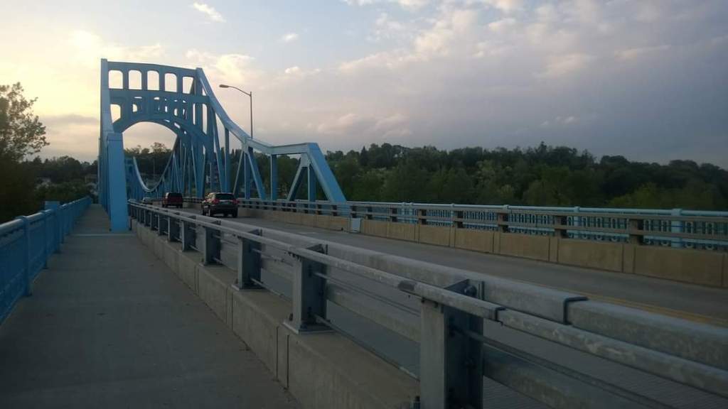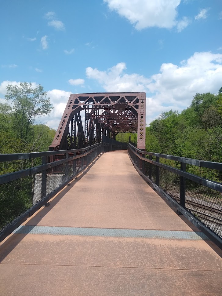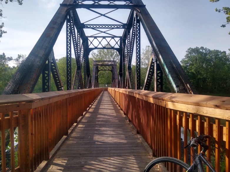 I stopped in Smithton that morning to eat a snack and some energy chews and enjoy the weather. Smithton doesn’t show up on a lot of guides, but I feel it should. It’s a nice, scenic stop if you’re not going off trail. There’s a fountain/bathroom in the parking area, some benches that overlook the river, ect. Even if you are going off trail, there are hotels and other food/water sources nearby, within 2 miles. The sign warns to use caution if you’re going to cross the bridge, but the accommodations I originally looked at were not in an area that required bridge-crossing.