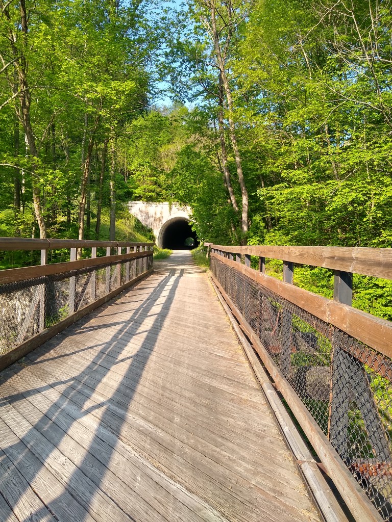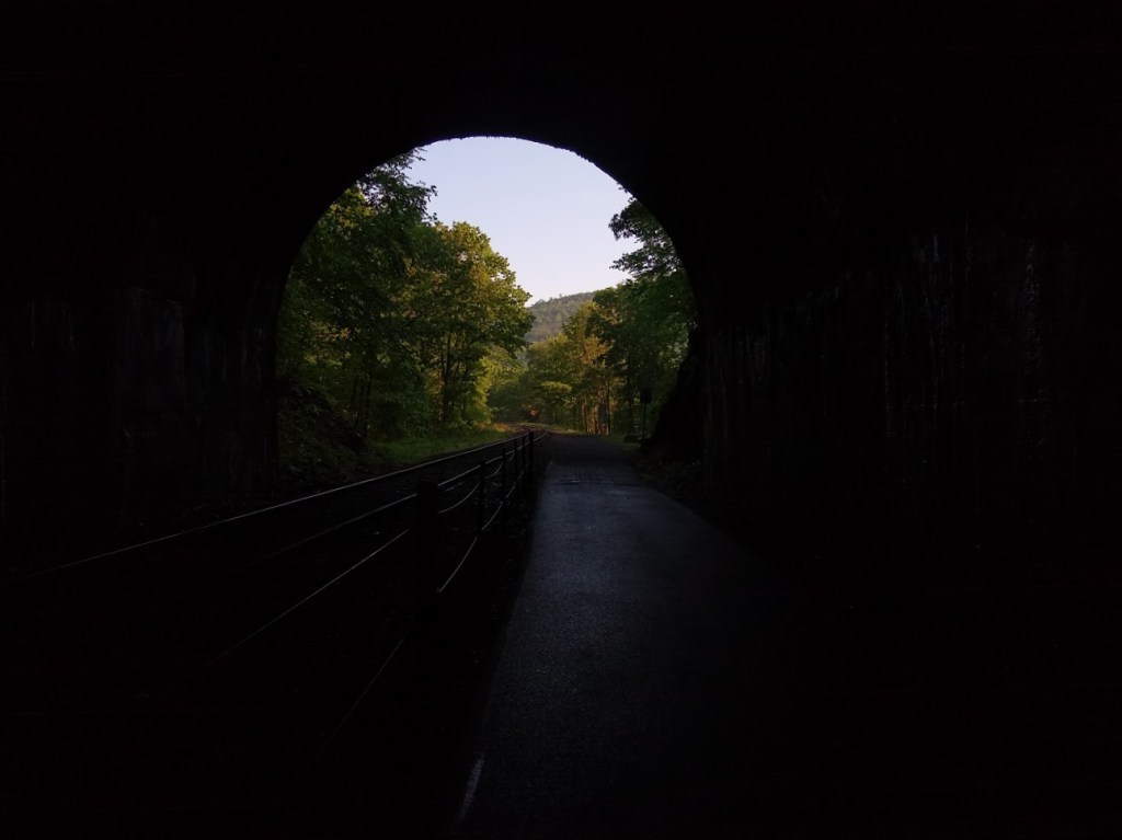 From Frostburg the next notable attraction is Borden Tunnel (around mile 17). This is a nice cool down from the hot day, so we stopped to snack again realizing there was no way we were beating this heat. My heart rate was in the 170s, probably due to the excess blood volume and I just felt as if the carbs consumed in Frostburg hadn’t hit yet.