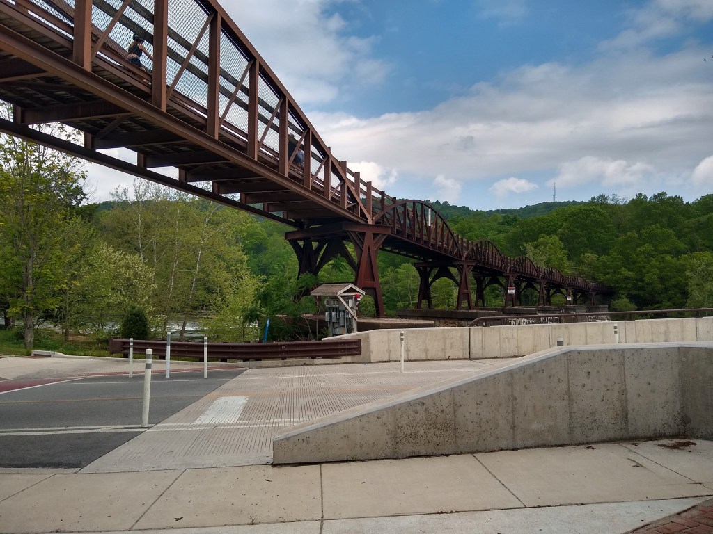 Starting out that morning we parked in the garage across the street (they do offer weeklong parking at a very reasonable rate) and we coasted toward the trailhead which is beside/ at the Western Maryland Scenic Railroad office. This is also the north end of the C&O Canal Towpath Trail, which I completed in 2014. Jenn and I had recently completed a segment of the C&O so it was cool getting to see this end of it again. Just like the Great Allegheny Passage, the C&O is full of historic landmarks and sites.