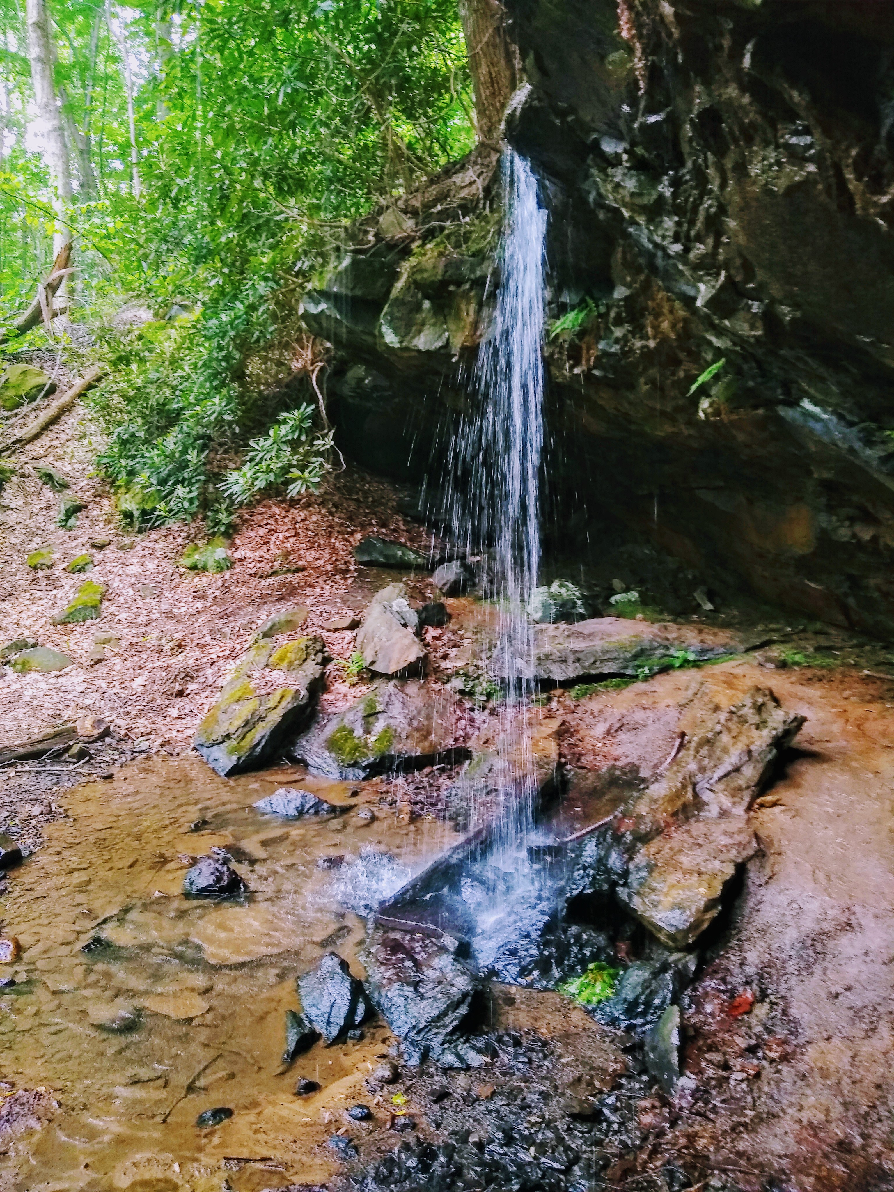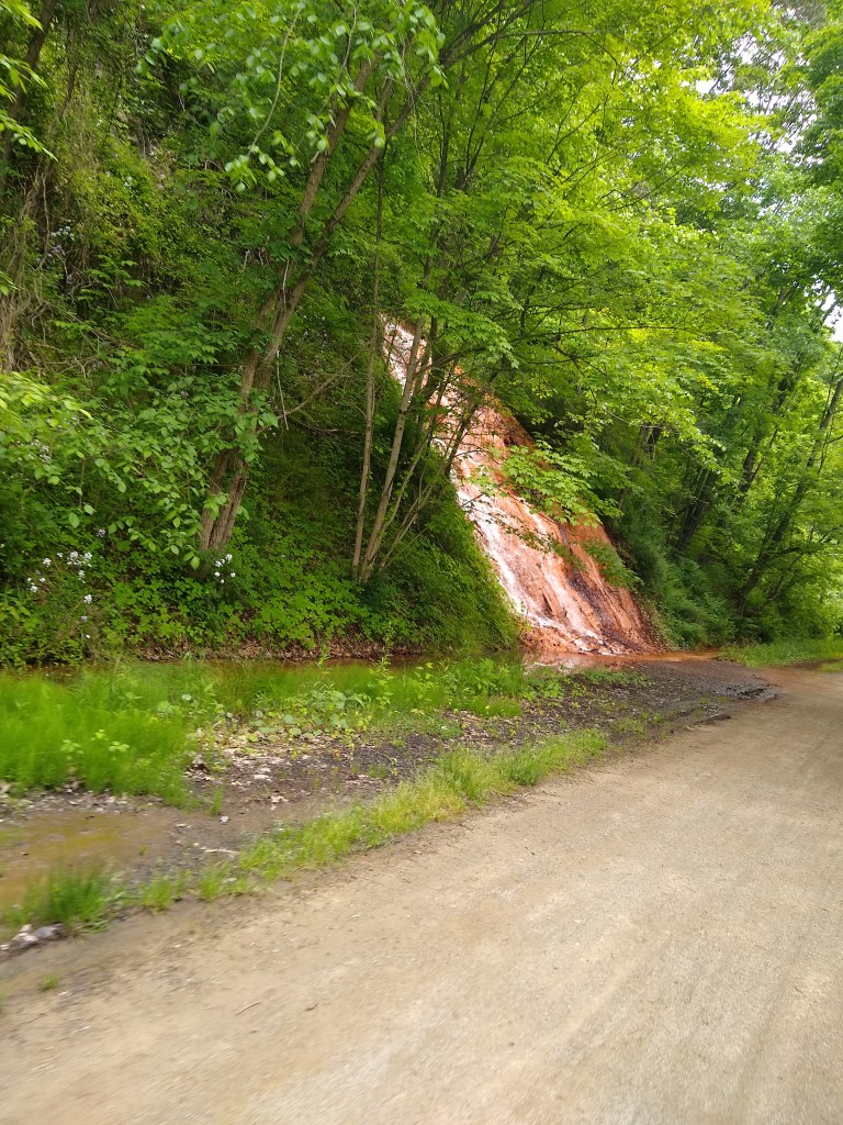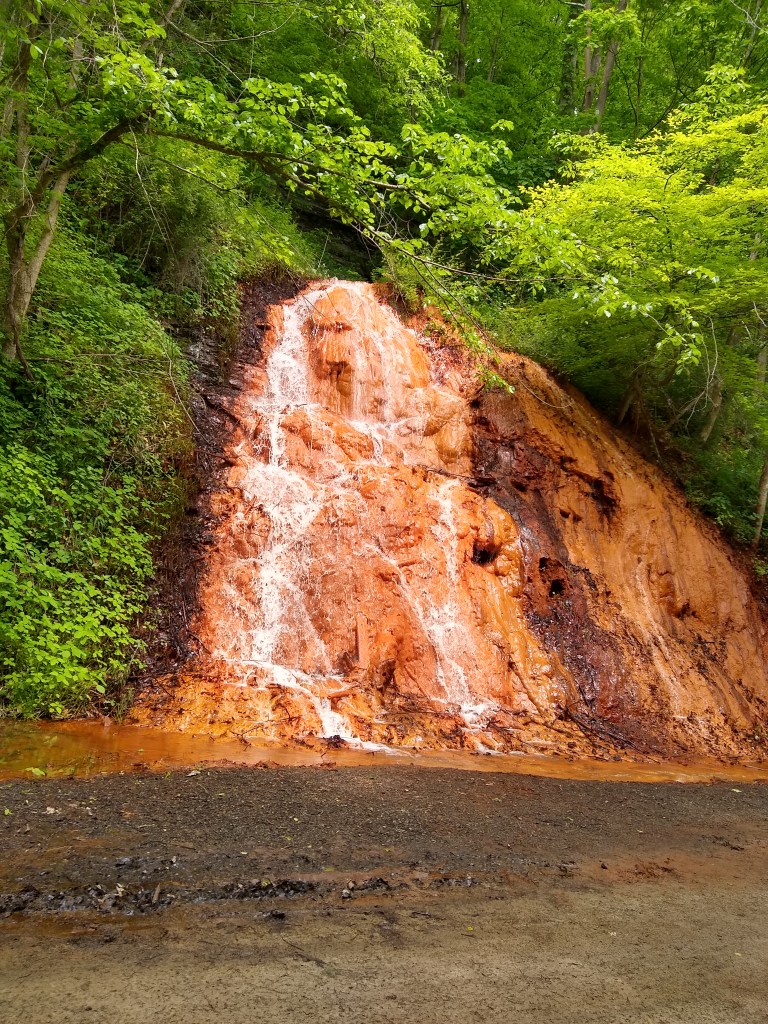 At mile 119, there’s a red waterfall, appropriately named “The Red Waterfall”. There’s a worn information plaque here that explains how the waterfall formed (and that it’s red due to the iron rich ground it’s flowing out of). It flows, rather quickly, beside the trail without flooding onto the trail both times I’ve passed it, and then under the trail through drainage pipes into the Youghiogheny. The scenery here has turned, albeit briefly, to an oversaturated beautiful green that’s contrasted perfectly by the red falls.