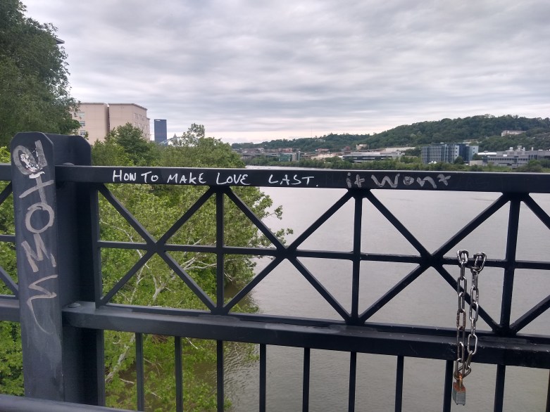 Before the last repurposed bridge, there’s some joker that painted on the trail “last hill” which made me giggle. They aren’t wrong though – the only climbs for there on out were really just the climb up the Hot Metal Bridge (Mile 146, and more of a switchback than a true hill). This bridge looks really badass at night in the pictures, but I haven’t been lucky enough thus far to see it in person at night. It is, regardless, a unique structure, and it signals “almost there” as you really feel you’re truly in Pittsburgh at this point.