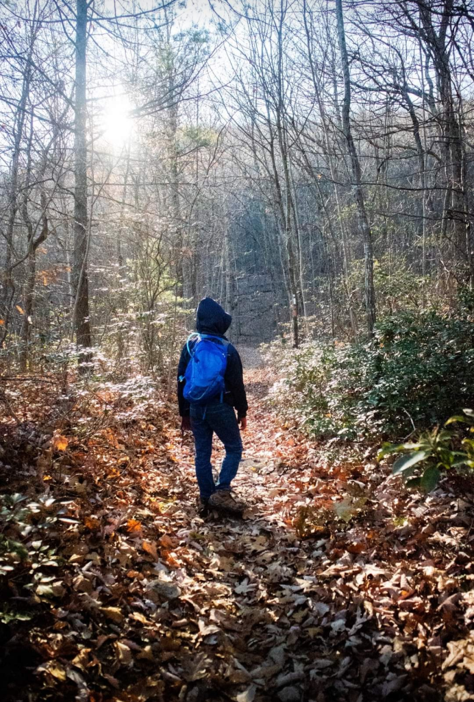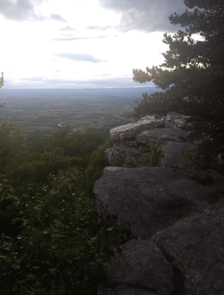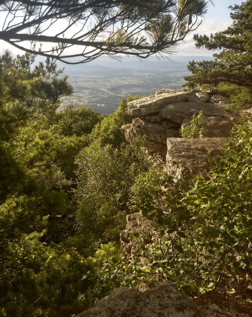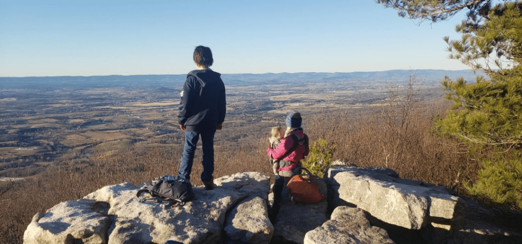 You’ll reach the top of this short hike at the 1.5-mile mark. There’s a beautiful outcropping of rocks that overlook the Shenandoah Valley and New Market, as well as the 211 descent into town.