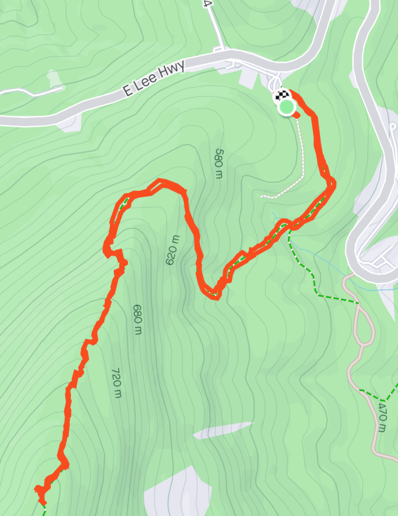 Around .75 miles in the terrain levels out a bit, with a small glimpse through the trees, and starts to climb steeply again, resuming 15-20% grades.