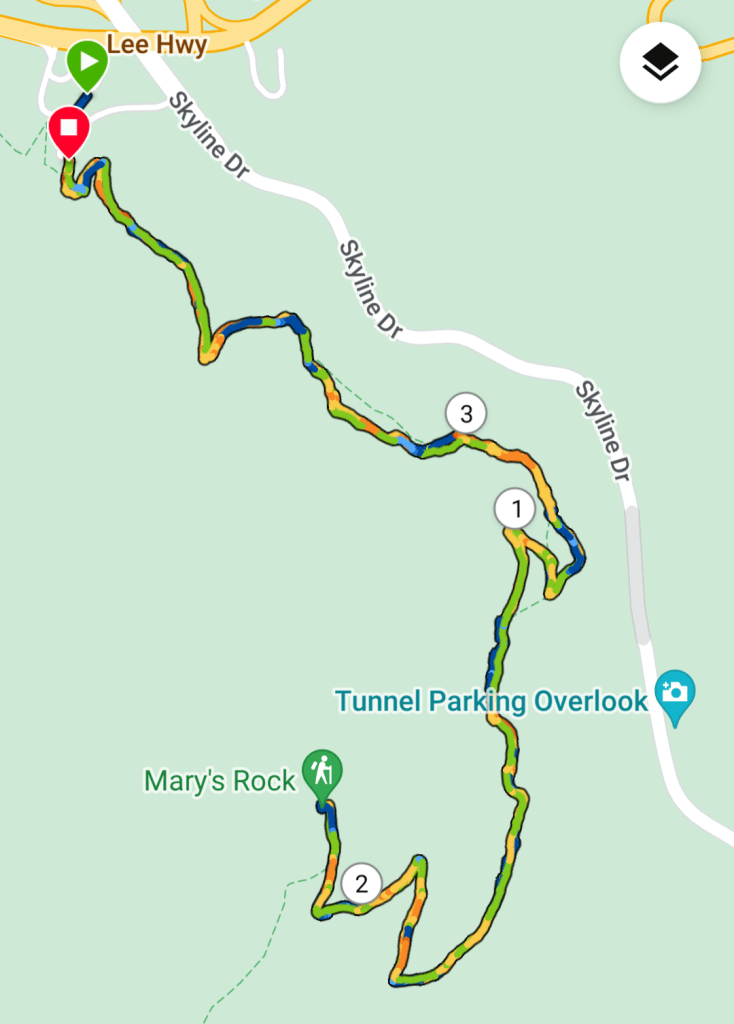 Initially the trail winds around the west face of the mountain overlooking a stream. Eventually switching to look east, overlooking skyline drive as the trail narrows. During times of high precipitation, there’s an underground spring that can be heard roaring beneath the trail around mile 0.75.