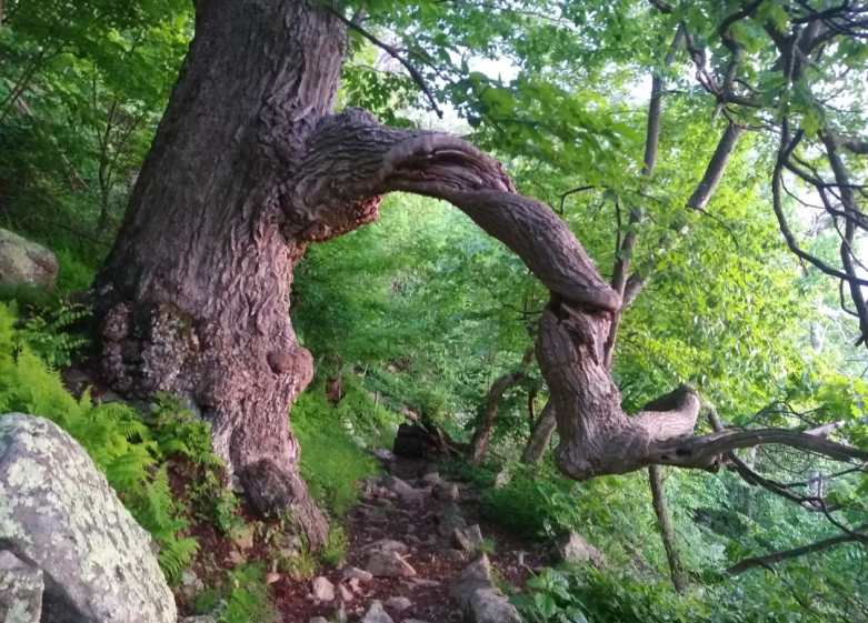 Approximately one mile from the top stands a very odd and unique tree, twisted over the trail itself.